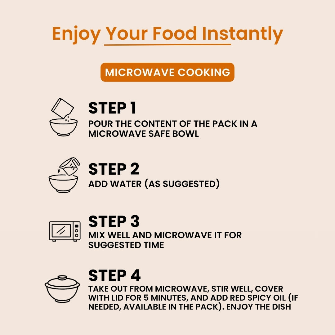 Enjoy your meal instantly with two simple cooking options: Stove Cooking or Microwave Cooking.