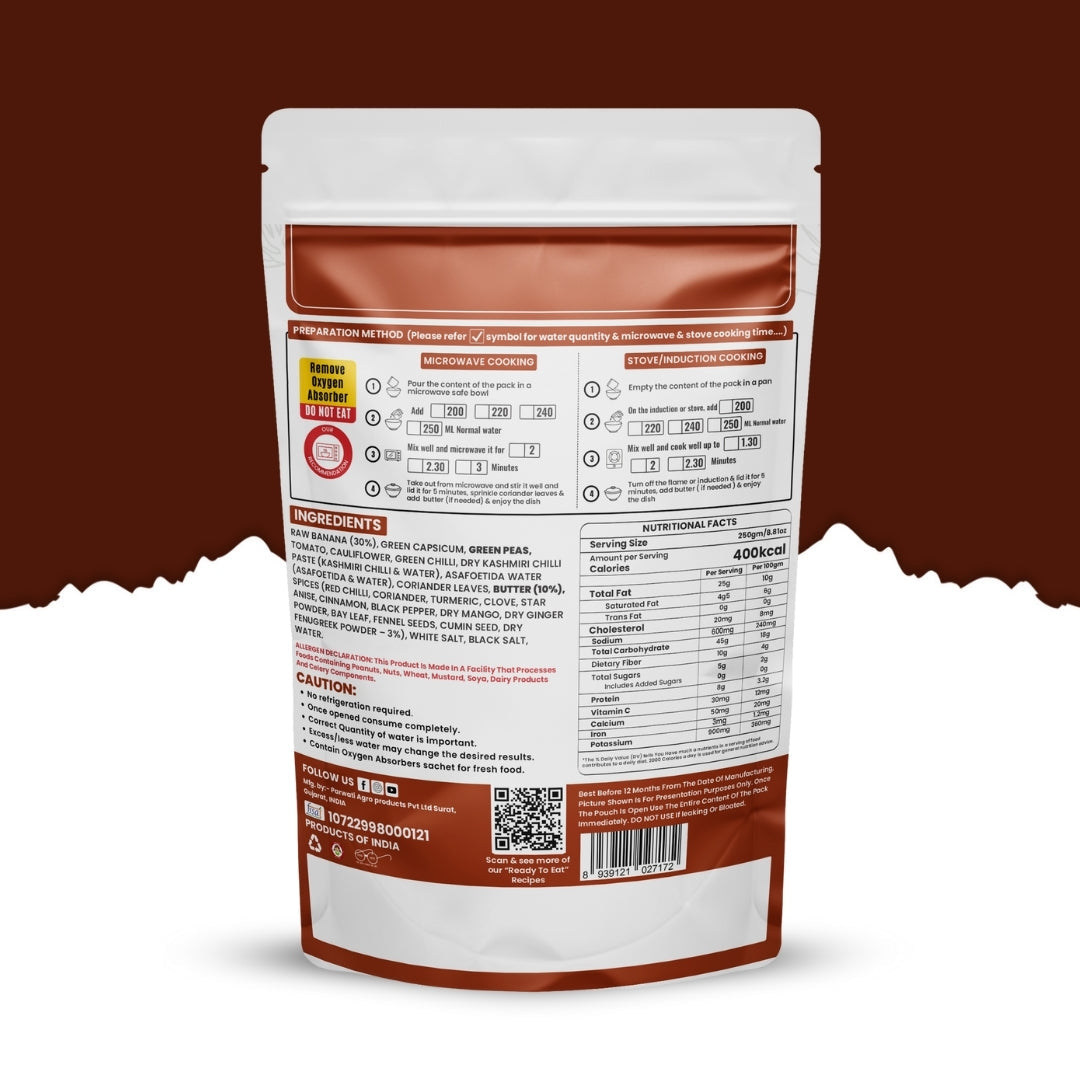 RAW BANANA (30%), GREEN CAPSICUM, GREEN PEAS, TOMATO, CAULIFLOWER, GREEN CHILLI, DRY KASHMIRI CHILLI PASTE (KASHMIRI CHILLI & WATER), ASAFOETIDA WATER (ASAFOETIDA & WATER), CORIANDER LEAVES, BUTTER (10%), SPICES (RED CHILLI, CORIANDER, TURMERIC, CLOVE, STAR ANISE, CINNAMON, BLACK PEPPER, DRY MANGO, DRY GINGER POWDER, BAY LEAF, FENNEL SEEDS, CUMIN SEED, DRY FENUGREEK POWDER – 3%), WHITE SALT, BLACK SALT, WATER.