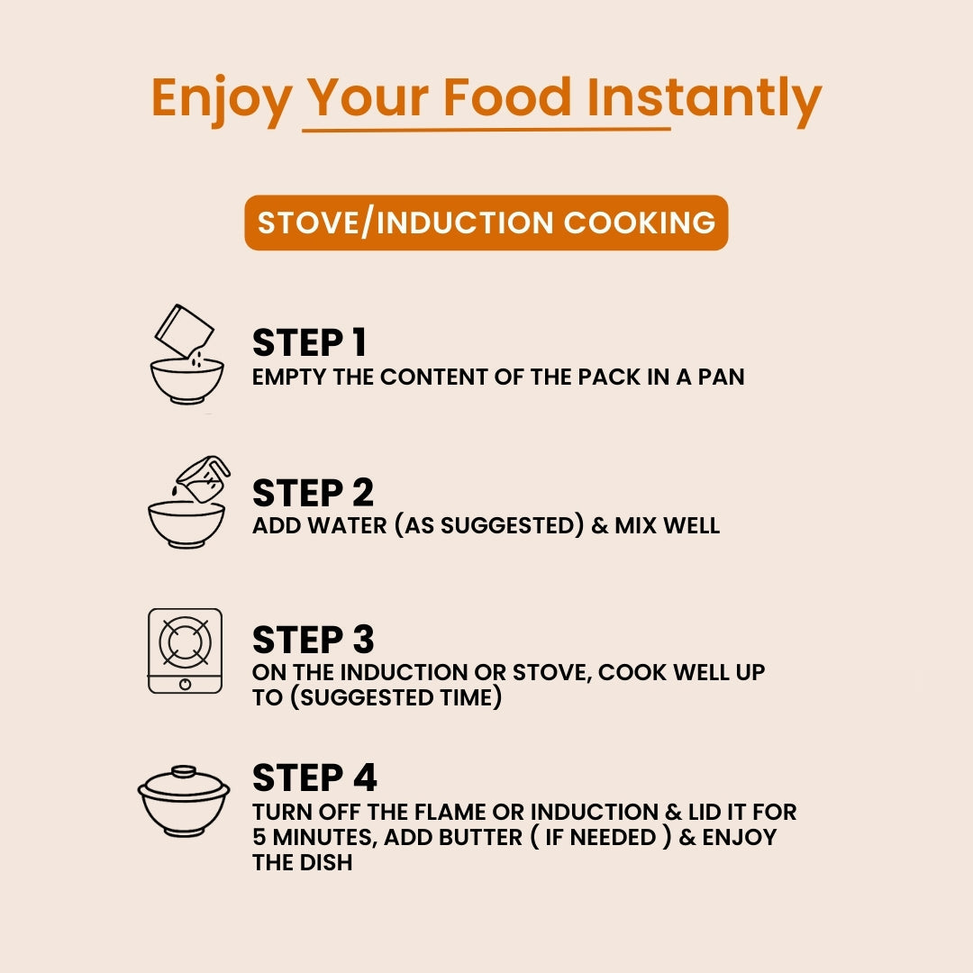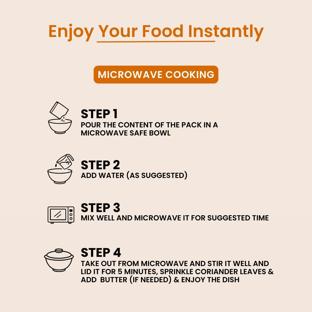 Enjoy your meal instantly with two simple cooking options: Stove Cooking or Microwave Cooking.