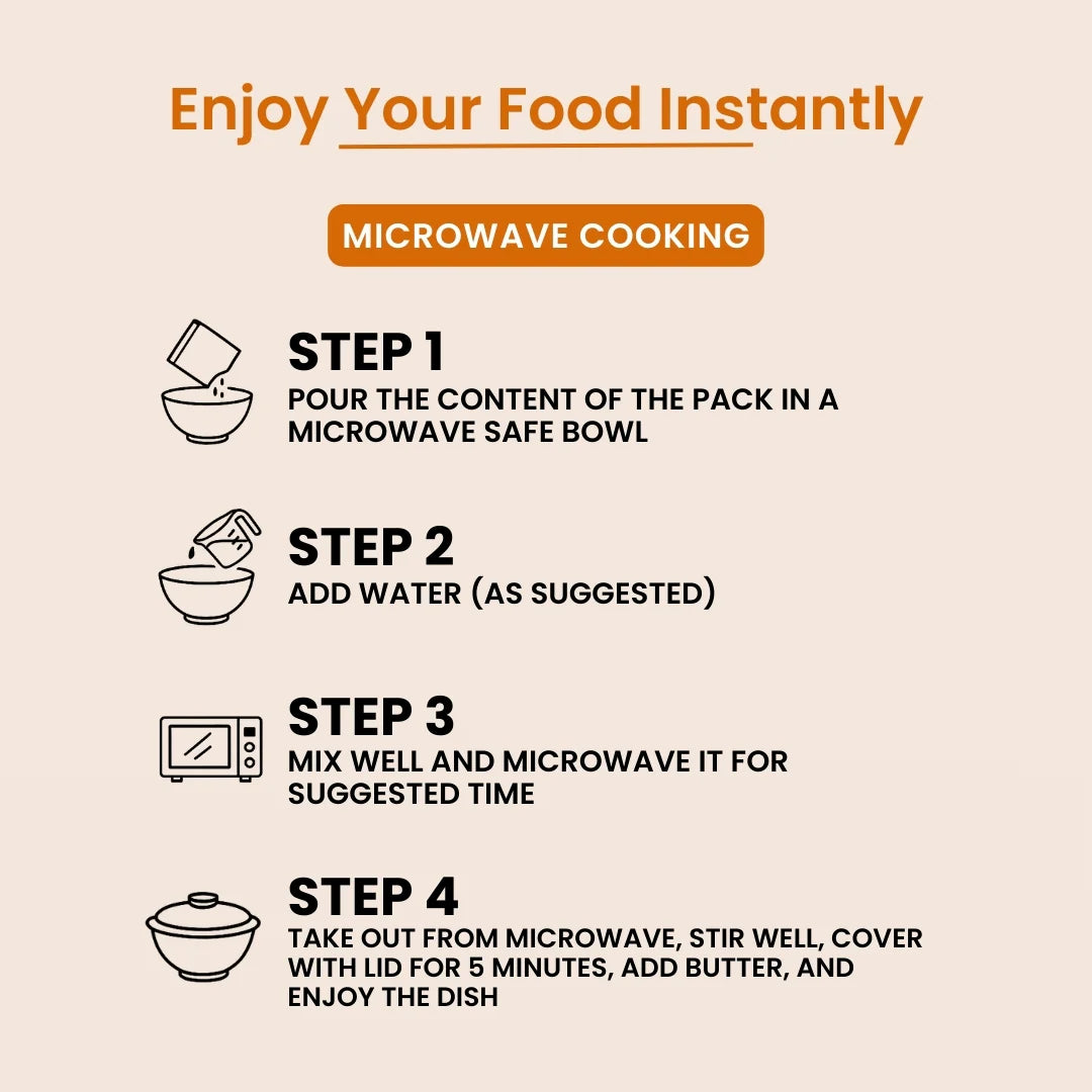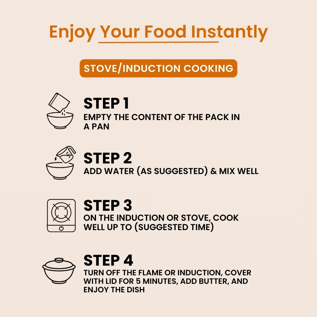 Enjoy your meal instantly with two simple cooking options: Stove Cooking or Microwave Cooking.